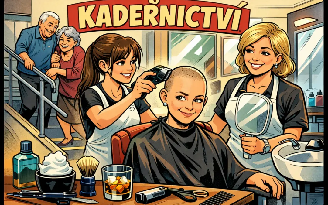 Otevírám prosklené dveře do salónu, kde sedí důchodce, a za stolem, který je recepcí, se na mě usmívá paní kolem čtyřiceti let. „Dobrý den, jsem tu poprvé a chtěla bych poprosit, zda by bylo možné mi oholit hlavu,“ zeptám se s úsměvem. Recepční se na mě usměje a odpoví: „Jistě vám rády hlavu oholíme, ale tady jste na kosmetice. Tady vám můžeme udělat lepší obličej. Musíte do těch dalších dveří.“ Odpoví a její ruka mi ukazuje vzdálenější prosklené dveře do učiliště. Zní to lákavě. Škoda, že dnes mám v plánu jen upgrade hlavy, pomyslím si. „Aha, tak obličej nechám na jindy, teď potřebuji zkrotit kadeře. Děkuji a mějte se moc hezky.“ Rozloučím se a odcházím správným směrem.